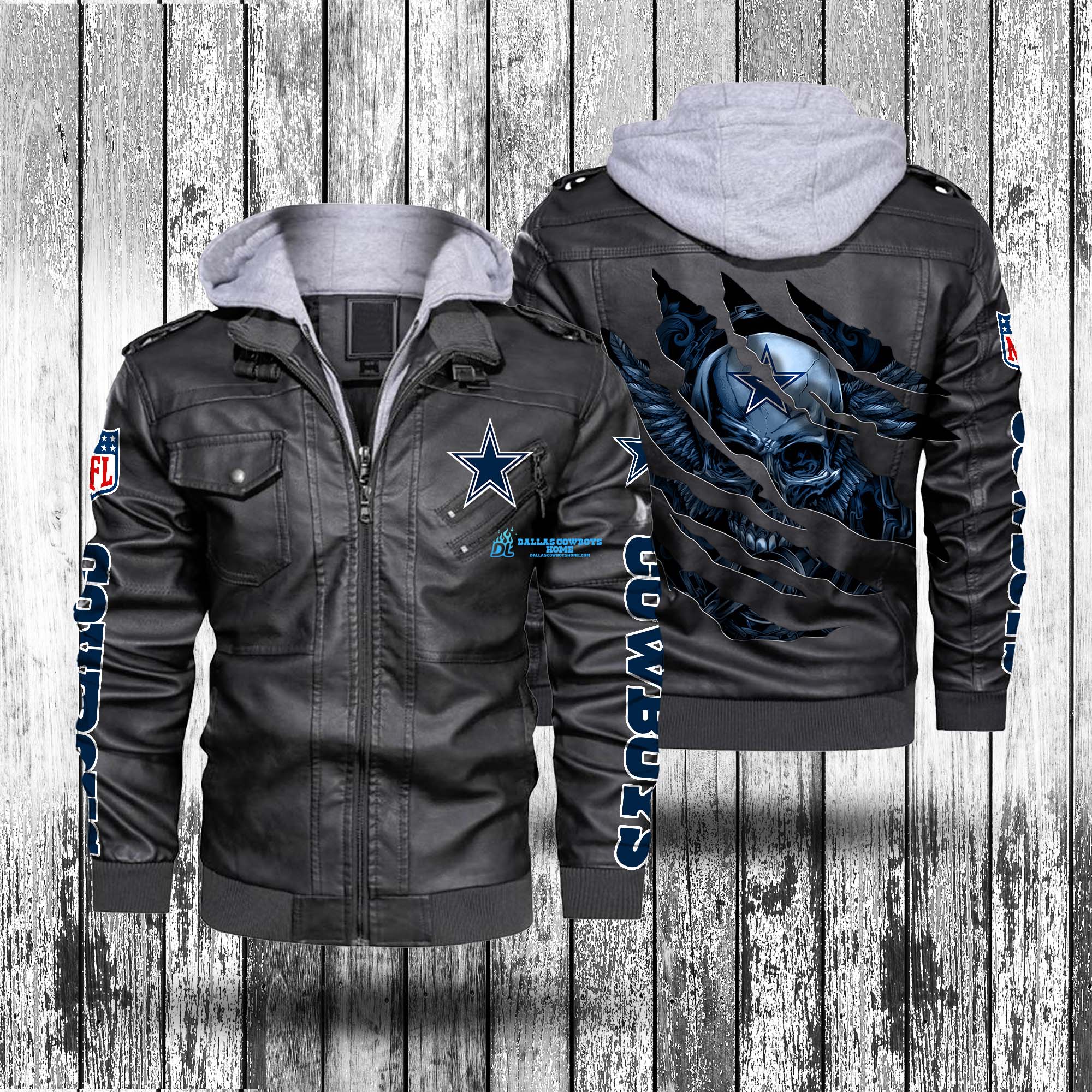 The Dallas Cowboys Leather Bomber Jacket is a gray hooded leather jacket with a unique shelf design for motorcyclists combined with the Cowboys logo that will make you stand out on every road.